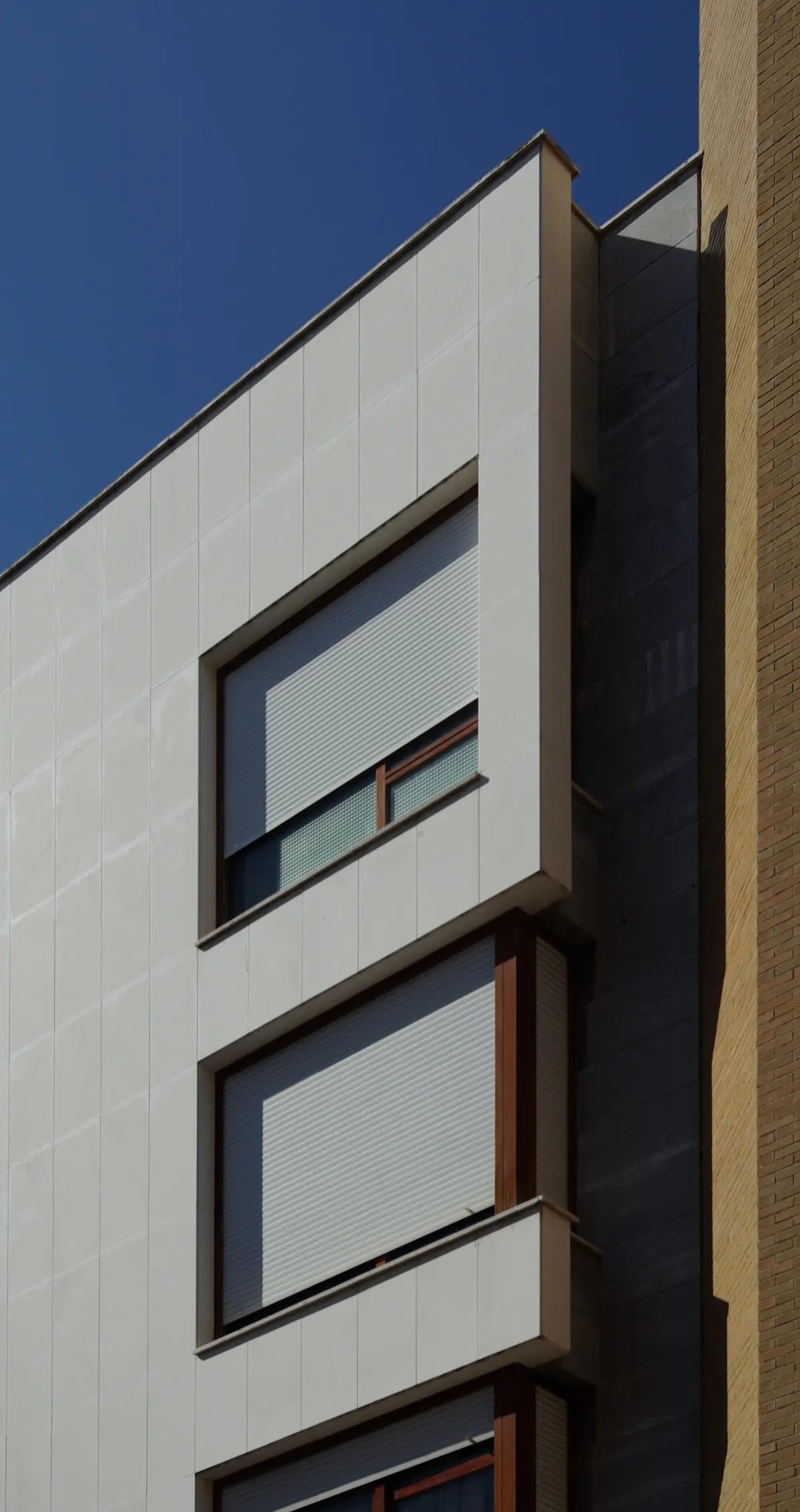 Las fachadas se modulan con los huecos siguiendo el ritmo del revestimiento de piedra caliza blanca, que contrasta con la carpintería de madera. Las salas de estar tienen mirador en esquina y los dormitorios balcón, salvo en la última planta en la que el mirador se convierte en una doble ventana que contribuye a rematar el edificio. Los extremos de la fachada y la planta baja están revestidos de piedra oscura, aspecto que, junto con el voladizo de la fachada, hace que ésta parezca quedar en suspensión.